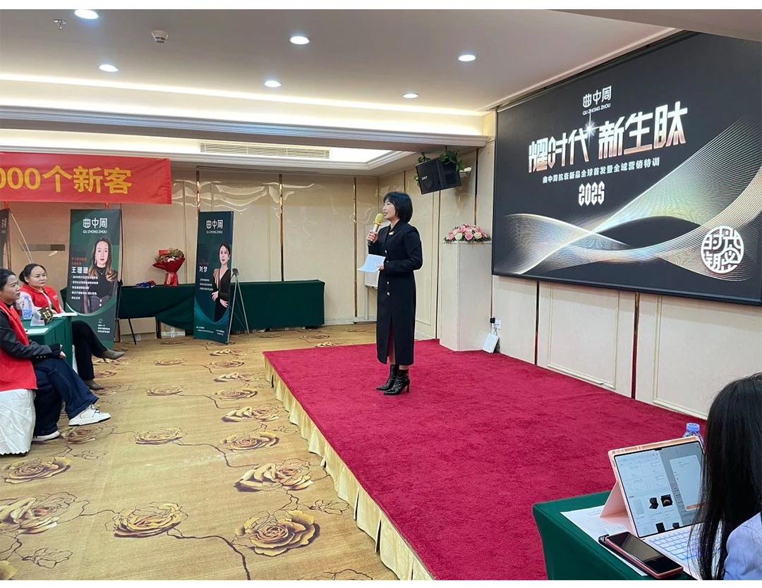 曲中周品牌以差异化竞争为市场打开创新突破口,同时聚焦下游市场,提供全方位的技艺支持。本次盛典为经销商家人们提供了一套全新的拓客系统,特别邀请到北辰老师、 朱少卿老师、吴冲老师等为大家讲解。通过这套系统,门店可以精准锁定目标客户群体,每年增加200-1000组新客,实现业绩暴涨。现场老师还分享了多个成功案例,展示了如何通过线上线下结合的方式,迅速扩大客户基础并提升转化率。