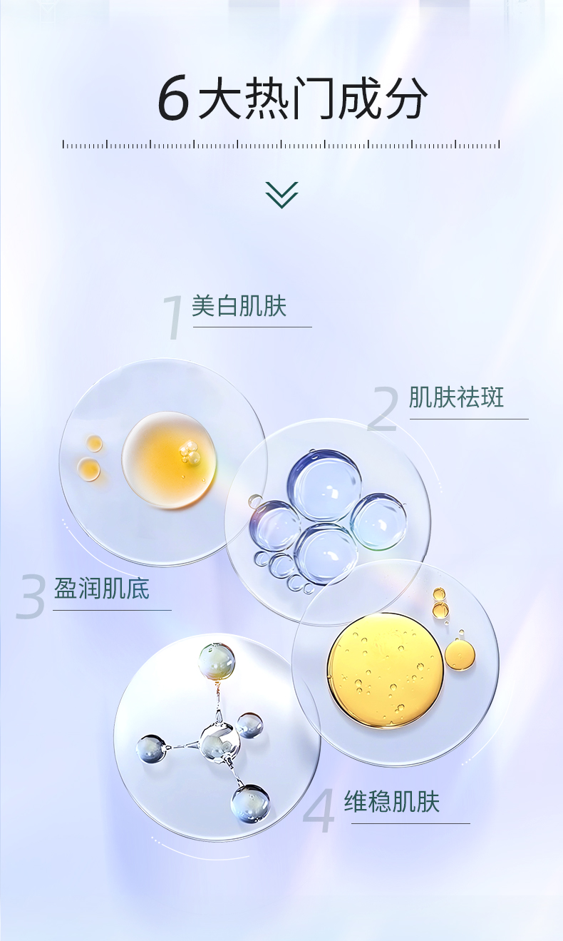 富含烟酰胺、α-熊果苷、壬二酸美白淡斑成分,源头抑黑,淡化色印,肌肤白里透嫩,亮白出彩